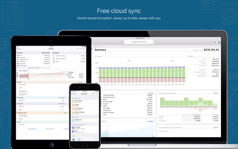 No matter where you are, you can enter transactions on the go with Banktivity for iPhone, or sync accounts, budgets and investments to Banktivity for iPad for mobile money management (apps sold separately).