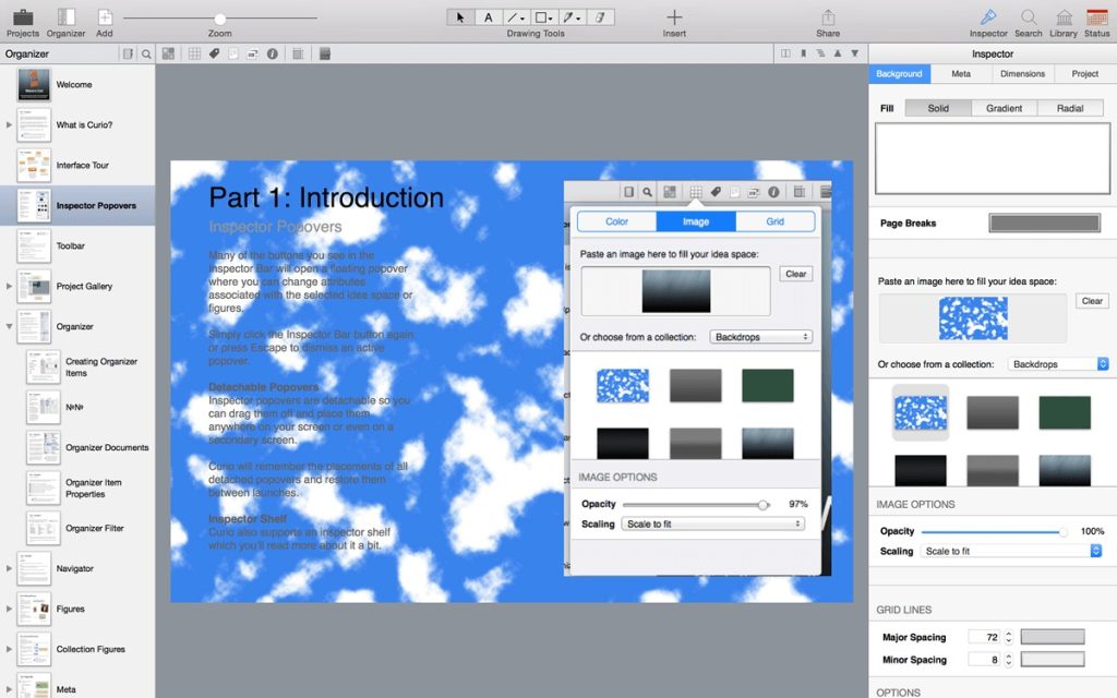 The heart of Curio is the idea space. Think of idea spaces as your whiteboard, notebook, and sketchpad all wrapped up into one. Within a Curio project, you can create an unlimited number of idea spaces where you can place anything anywhere on the page. Brainstorm or organize your notes with freeform collages of text, images, URLs, documents, Mail messages, movies, and sounds. Give the idea space a note paper or graph paper style, or perhaps a linen paper texture. This is your idea space, with your notes and ideas. Make it the way you want it to look.