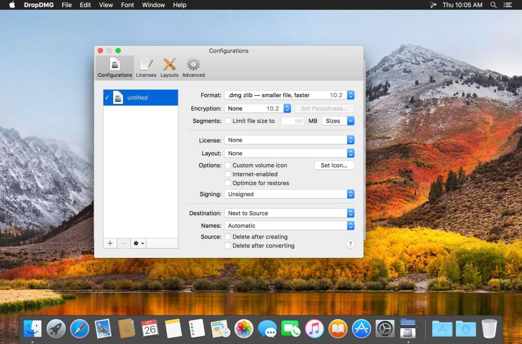 DropDMG supports advanced options such as encrypted and segmented disk images, WYSIWYG layout with background pictures and custom volume icons, and rich-text license agreements in multiple languages. There are many time-saving features, and it can also be automated via AppleScript, the command-line, and Automator.