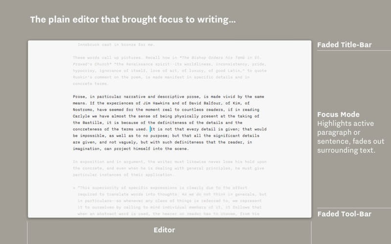 - Focus Mode fades all but the current sentence, for maximum concentration