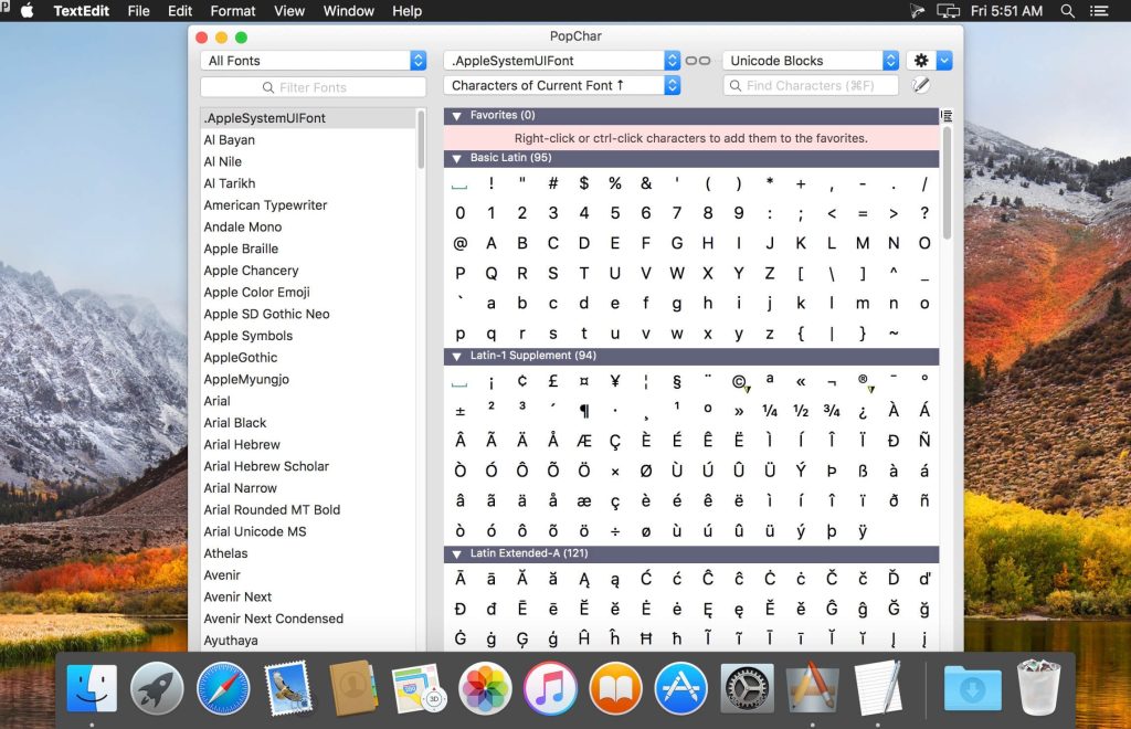 The grid-like character table of PopChar gives you an excellent overview of all characters in a font, neatly arranged in sections according to the Unicode standard, by scripts and symbols, as well as in custom layouts.
