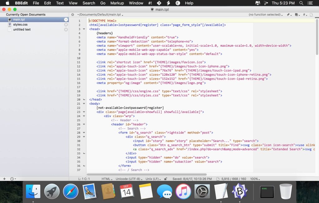 An intelligent interface provides easy access to BBEdit’s best of class features including grep pattern matching, search and replace across multiple files, function navigation and syntax coloring for numerous source code languages, FTP and SFTP open and save, AppleScript, Perl, and OS X Unix scripting support, glossary support, and a complete set of HTML tools.