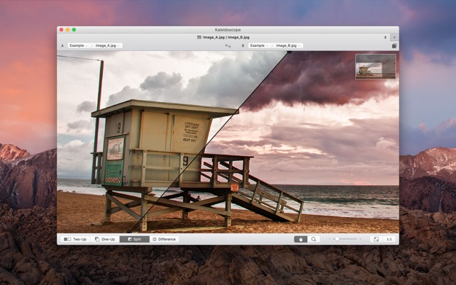 - Compare images in four different modes: Two-Up, One-Up, Split and Difference
