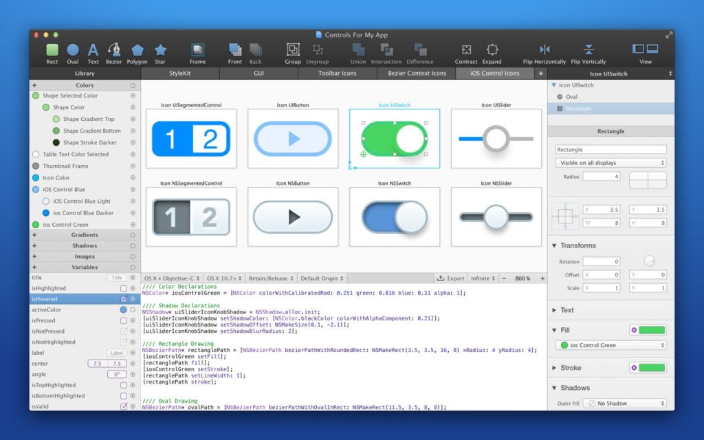 PaintCode is a vector drawing app that instantly generates Objective-C or C# drawing code. With PaintCode you can create an app that is truly resolution-independent, using code (instead of large number of image assets) to draw a user interface.