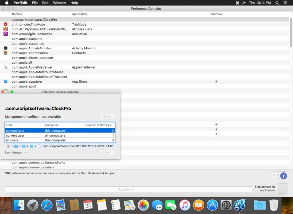 PrefEdit is a utility that allows you to inspect and edit all preference settings for OS X applications. The settings are displayed in a browser and can be edited by simple point-and-click operations. You can also do a full-text search on all settings, or clean up unused entries of applications that have been uninstalled.