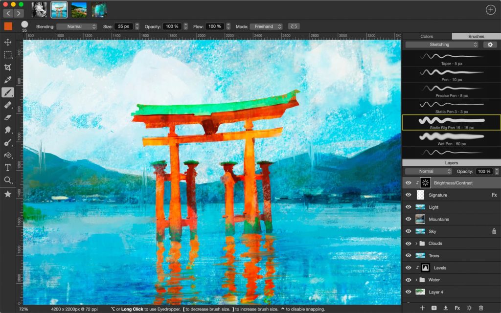 The powerful GPU accelerated ArtEngine developed by Lucky Clan is 5-10 times faster than the previous engine. It allows working with multiple documents, supports large canvas sizes and an unlimited number of layers. Incredible optimization ensures smooth work even with large canvases.