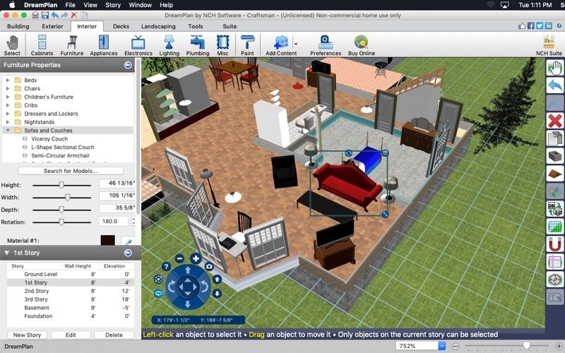 When the layout is ready, add objects fully visualize your new bedroom, kitchen, bathroom, and more. Make your perfect backyard by building up or lowering your yard’s terrain for outdoor landscaping. Upload 3D models and download additional content to explore even more designs. DreamPlan is the perfect product to begin working on a new house or a home improvement project.