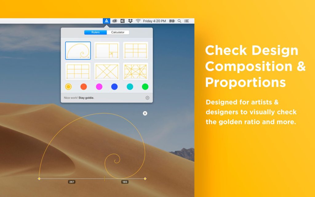 Goldie helps you easily visualize or calculate the golden ratio and many other proportions right on your screen.