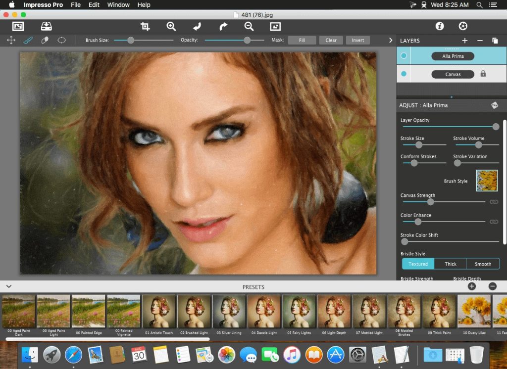 - Alla Prima (‘wet-on-wet’ or ‘all-at-once’)—is great for portraits! This beautiful paint style starts by filling the painting with an abundance of brushstrokes. A library of artistic finishes compliments this style by adding light, color and movement with controls over strength.