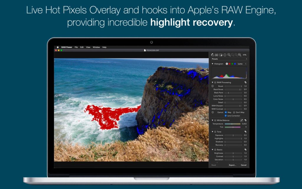 • Unparalleled highlight recovery. Real-time control of Apple’s RAW, including Noise Reduction, Black Point, Gamut Mapping and more