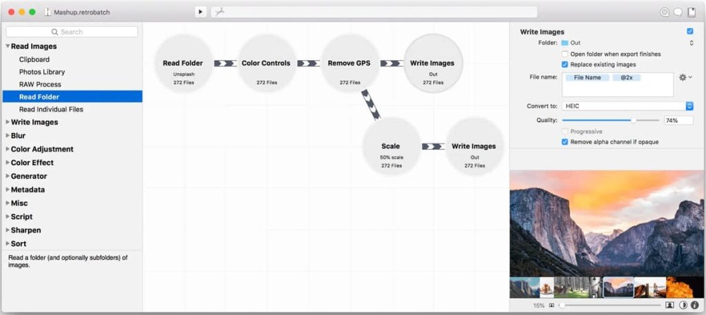 – Super Charged: A node for every operation, from changing DPI to rotation to Machine Learning to custom behaviors with AppleScript. Optimize your images for fast delivery over the Internet.