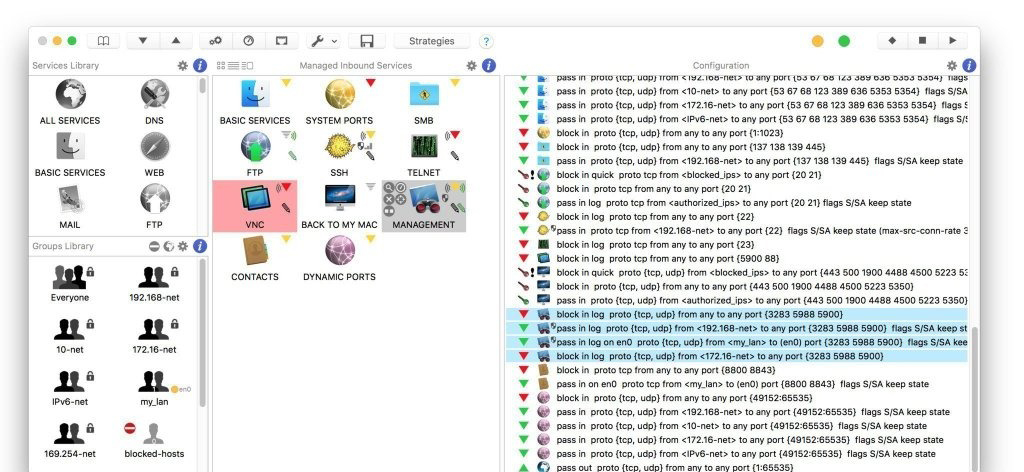 Forget all about command line. Murus offers you the possibility to access advanced proactive features like port knocking and adaptive firewall in one click. The strong logging ecosystem offered by Murus and its companion app PF Log Reader grant the user a fully customizable logging policy, a realtime graphical view of PF logs and statistics and a user-defined notifications system. Share your Internet connection and define per-client access limits and accounting, export LAN services to the Internet with port forwarding. Everything is done simply using icons, checkboxes, buttons. And everything is based only on features and tools already built into macOS.