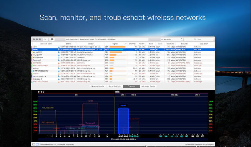 WiFi Explorer Pro takes the code base of WiFi Explorer, and adds a set of features that makes it the right tool for WLAN and IT professionals. You can use WiFi Explorer Pro for preliminary assessments, to help design and validate wireless networks installations, as well as to identify channel conflicts, overlapping, poor signal quality and other issues that may be affecting the connectivity or performance of your home, office or enterprise wireless network.