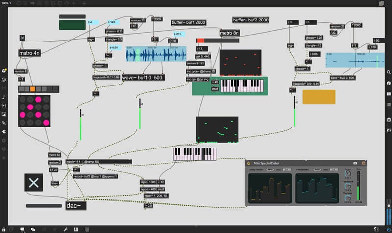 Max patching starts on a blank canvas, free of any structure. This makes it natural to build and explore unique ideas that would be too complex to make elsewhere. The Max patcher automatically expands to fit your work as it grows, no matter how much space you take up.