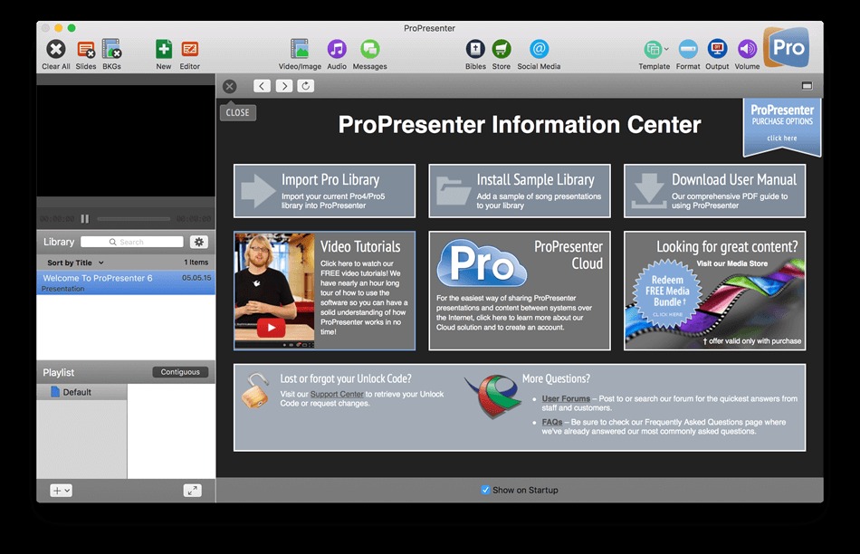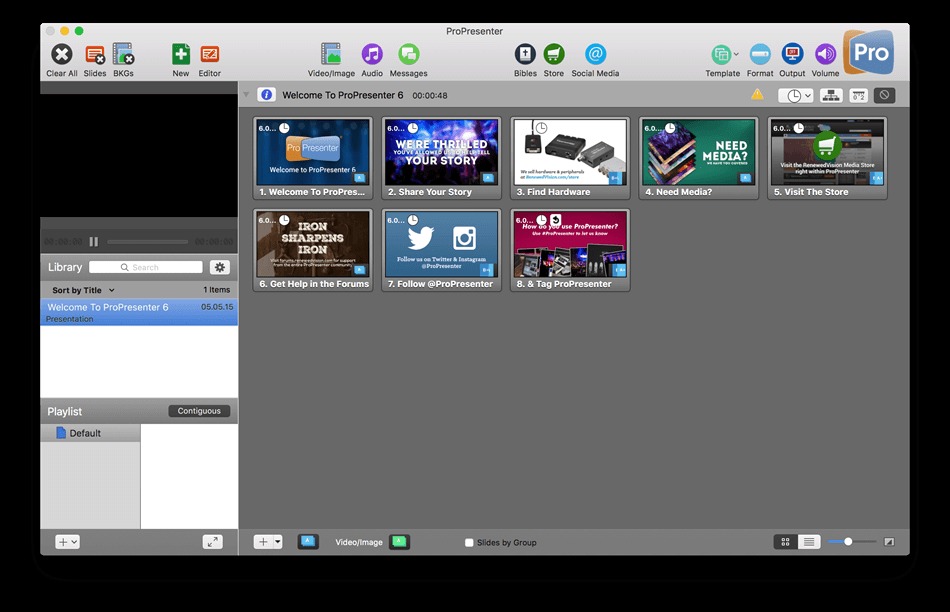What’s more, the program supports QuickTime, and can synch slides with an audio track for canned music presentations. ProPresenter also allows you to change your backgrounds dynamically and, of course, you can integrate ProPresenter with your video production system to key the words over live or recorded video.