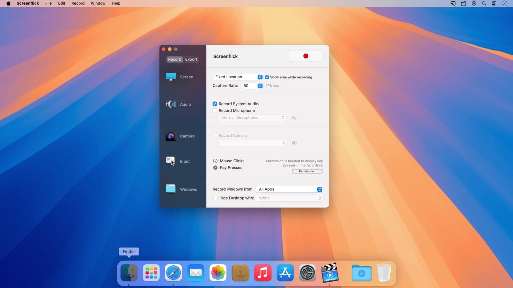Screenflick features high-performance screen capturing for smooth, fluid motion up to 60 fps. Screenflick can record any portion of the screen, simultaneously recording audio from internal or external microphones and the system audio.