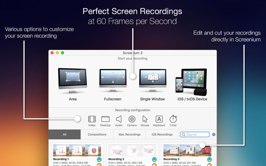 Record exactly what you see on the screen and turn it into a screencast in next to no time. Screenium 3 lets you record at 60 frames per second, offering optimum performance for your tutorials, gameplay recordings or any other screen content you wish to record. If you work with an ultra-high resolution 4K or 5K display or a Retina Mac, Screenium 3 puts you on the safe side as it creates the smoothest video quality possible for these types of devices.
