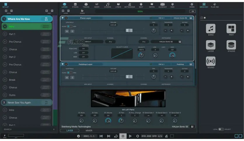 VST Live comes with a vast array of virtual instruments, sync features for your music, text and chord symbol displaying on other devices, video, Cubase import, MIDI tracks for direct DMX light control, and much more.