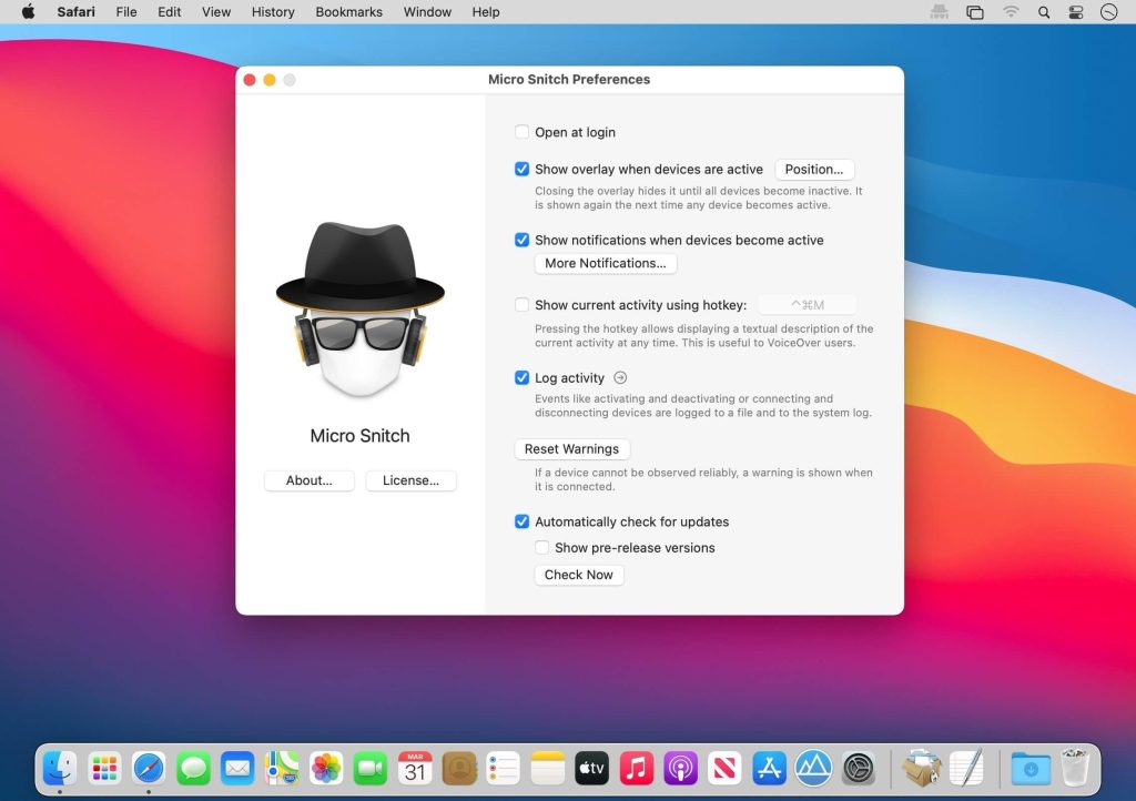 With Micro Snitch (was NOYB) there’s no doubt whether an application records audio through your Mac’s built-in microphone or if the camera captures video. This ultra-light menu-bar application operates inconspicuously in the background. It monitors and reports any microphone and camera activity to help you figure out if someone’s spying on you.