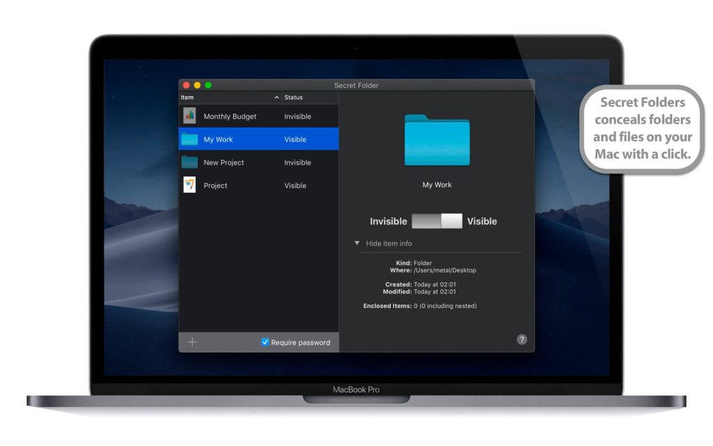 Secret Folder constitutes the perfect solution if you wish to prevent occasional users of your Mac to view, open, or change files or documents while browsing the contents of your hard drive.