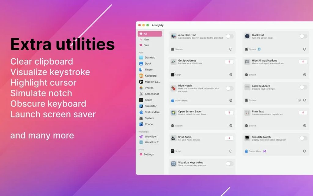 In Almighty, you can create your own scripts and organize your settings into a workflow to perform all actions at once. Each task can be configured with a keyboard shortcut to complete it even faster.