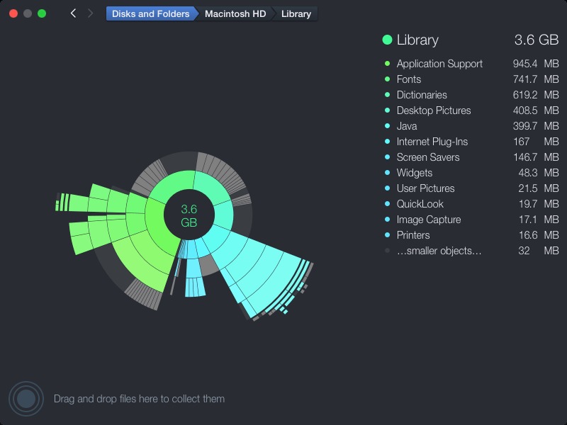 The program scans your disk and displays its content as a sector diagram where the biggest files and folders at once become obvious. To drill down to a folder, just click on a segment. To bubble up, click in the center. Move the mouse over the diagram and see the name and path of each file, and enclosed files (if any). Hit Space to quickly preview file content, without launching another application. In this way, walk around your disk and drag-and-drop all unneeded files into the “collector”. Expand the collector to check its contents. When done, clean it up with a single click.