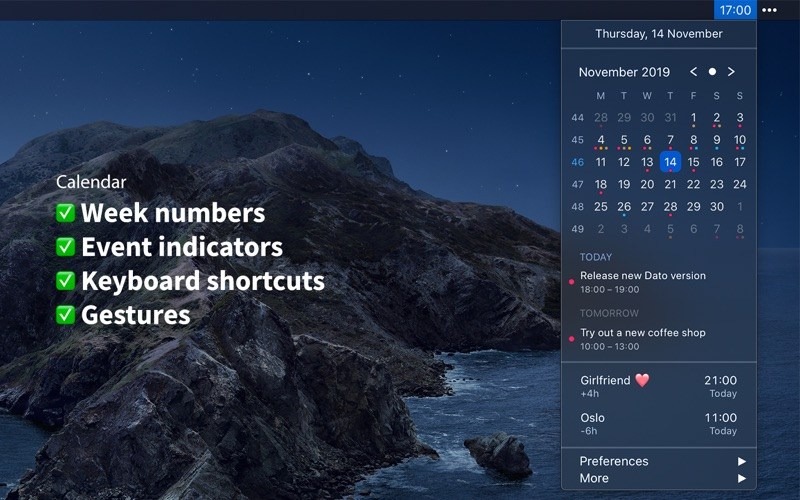 Dato gives you a local clock, date, and multiple world clocks in the menu bar. When you click Dato in the menu bar, you get a menu with a calendar, calendar events, and world clocks. All of this is highly customizable. Dato also comes with some macOS 11 widgets.