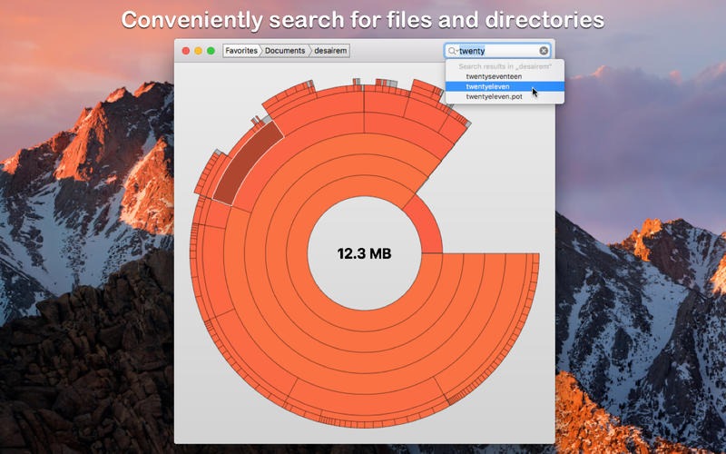 • choose between two modes: File Size Mode (where section sizes are relative to the respective file size) and File Count Mode (where section sizes represent the number of contained files).