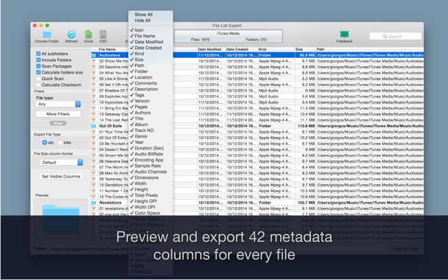 You can select a specific kind of file to list. For example, you can choose to export to Excel a list with all the audio files of your iTunes Music folder or all the pdf files from your Documents folder.