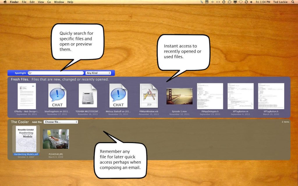 Filed Documents is a place where Fresh will file items by date, helping keep you organized. With Fresh you can easily find any file – no matter where you are – without going back to the Finder. Plus it has an awesome ‘file dock’ which works like the dock, but who has room for files on their dock anymore?