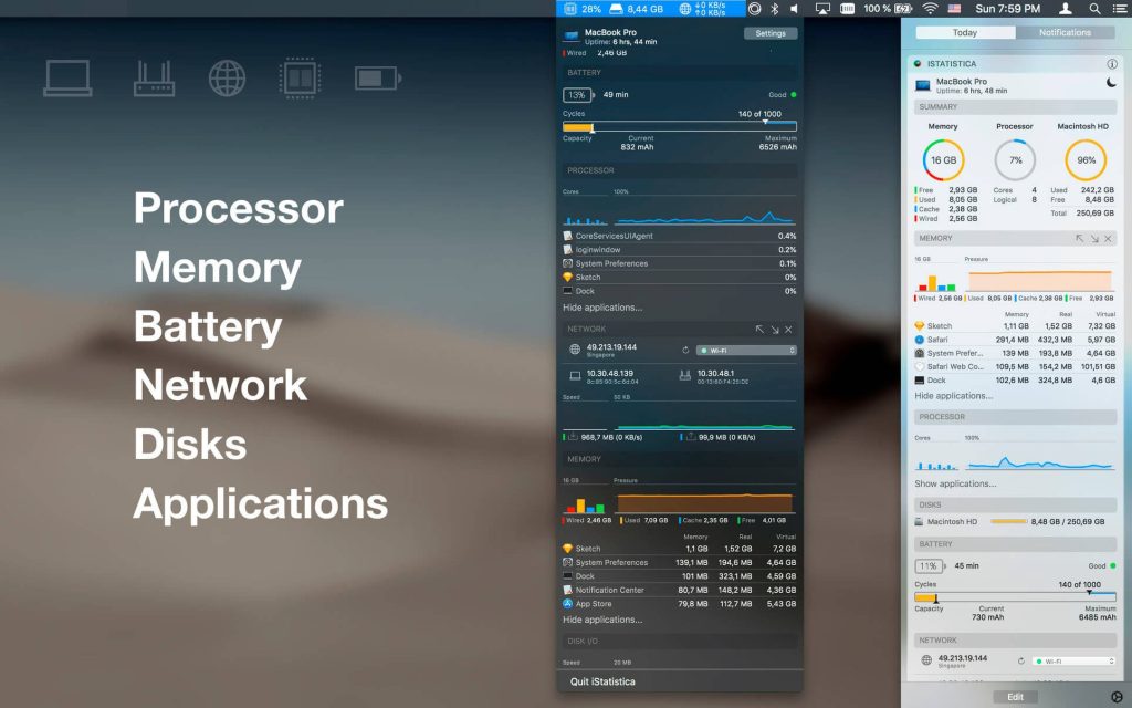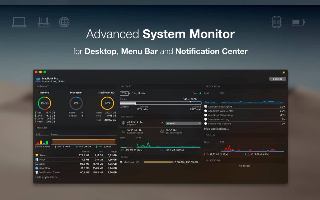 iStatistica Pro offers web-access to track CPU, Memory, Disk and Sensors statistics over local area network. Just enable web-access in application settings and point your browser to Mac’s address.