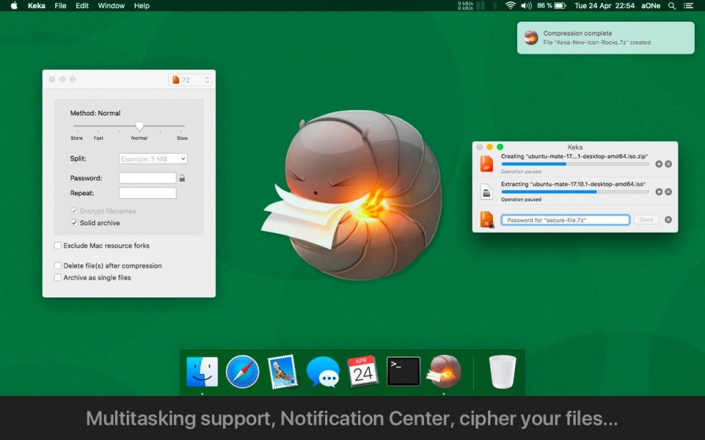 With Keka you can compress as many files as you want in a bunch of formats. Divide files and protect them with a password is now a kids game. Just drop the files you want to compress to the Keka icon in the Dock or the main window.