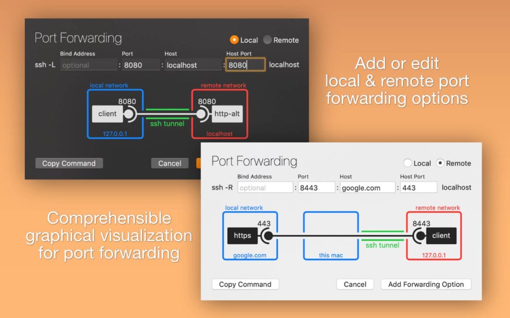 Handy tool for manage your OpenSSH ssh client configuration file. You can add or edit identity files, port forwardings (with graphical preview) and any other ssh config option.