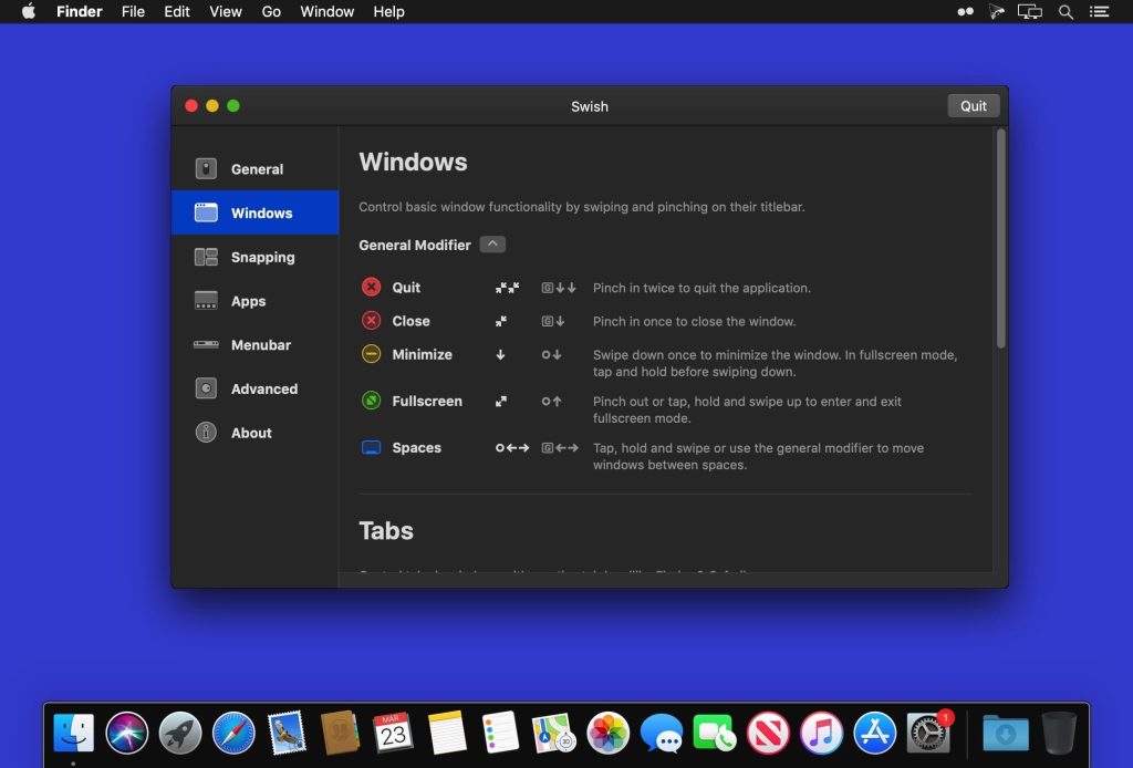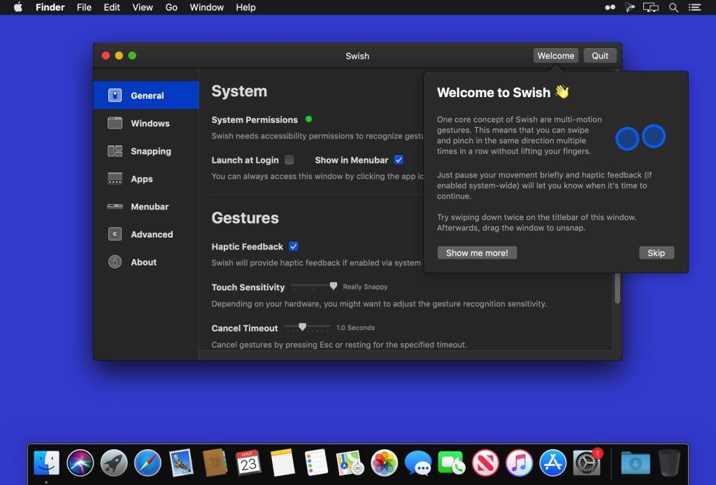 The missing gesture layer for macOS. Control windows and applications right from your trackpad with intuitive two-finger swipe, pinch, tap and hold gestures. Swish features 28 easy-to-use titlebar, dock and menubar gestures that will supercharge your workflow and make you a trackpad power user.